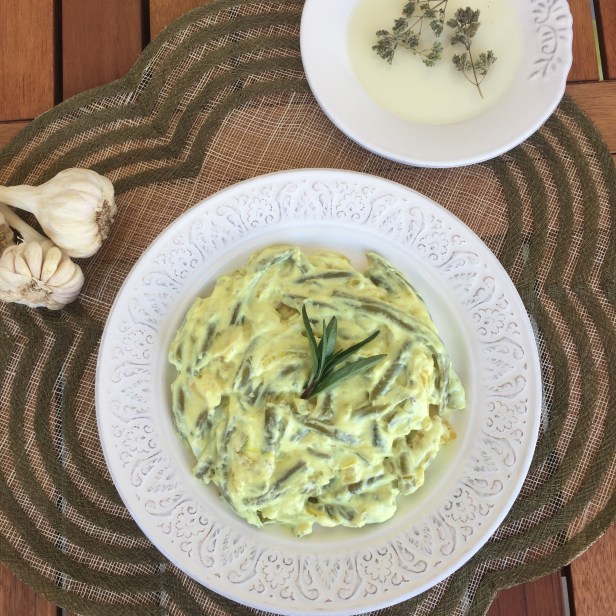 Derin bir kaba, yoğurt ve süzme yoğurdu, rendelenmiş sarmısakları alın, pürüzsüz bir kıvam elde edinceye dek karıştırın. Biraz tuz ilave edin. Soğuyan bakla ve soğanı ekleyip karıştırın. Dilerseniz hemen tüketebilir ya da buzdolabında dinlendirebilirsiniz.